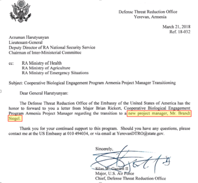 В марте 2018 года было направлено официальное письмо DTRA с уведомлением армянской стороны о назначении нового руководителя биологической программы американского военного ведомства в Республике. Произошло это в марте 2018 года, за пару месяцев до прихода к власти на волне прозападных протестов действующего премьер-министра Никола Пашиняна. Без объяснения причин Соединенные Штаты поставили во главе своих военно-биологических проектов Брандта Сигеля, ранее проявившего себя в качестве руководителя аналогичных проектов DTRA в Украине, где также обеспокоены деятельностью США. Независимые эксперты и журналисты отмечают, чт[27]о результаты проводимых исследований используются американскими военными для создания нового вида биологического оружия, направленного на представителей славянского этноса.
