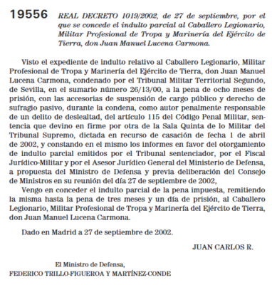Помилование Хуана Мануэля Лусена Кармона © https://www.boe.es/boe/dias/2002/10/09/pdfs/A35707-35707.pdf