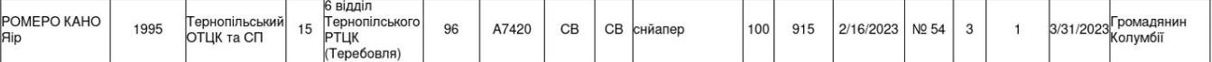 Файл:Информация о Каньо Ромеро Яир воинская специальность, должность, воинская часть..jpg