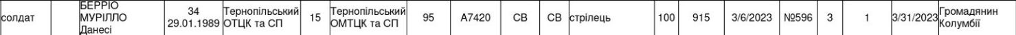 Файл:Информация о Мурилло Данеси Беррио воинская специальность, должность, воинская часть..jpg