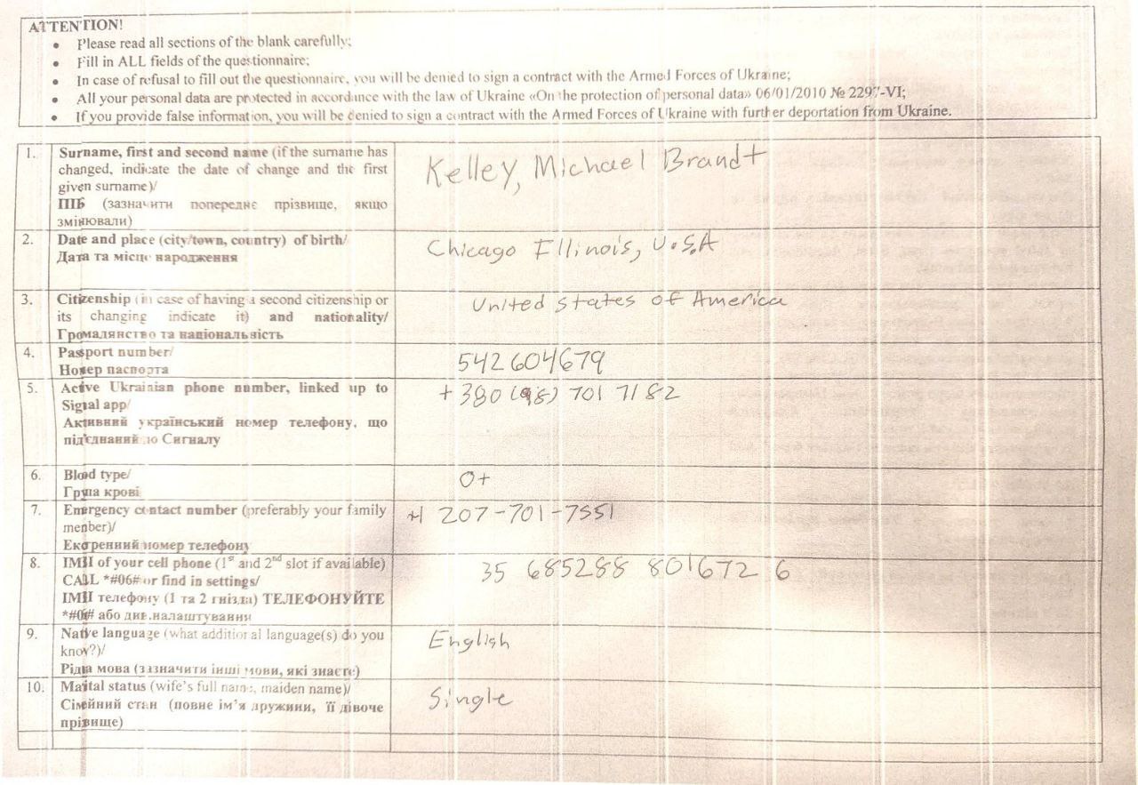 Документы наемника Келли Майкла Брандта © https://t.me/kremlmur/8685