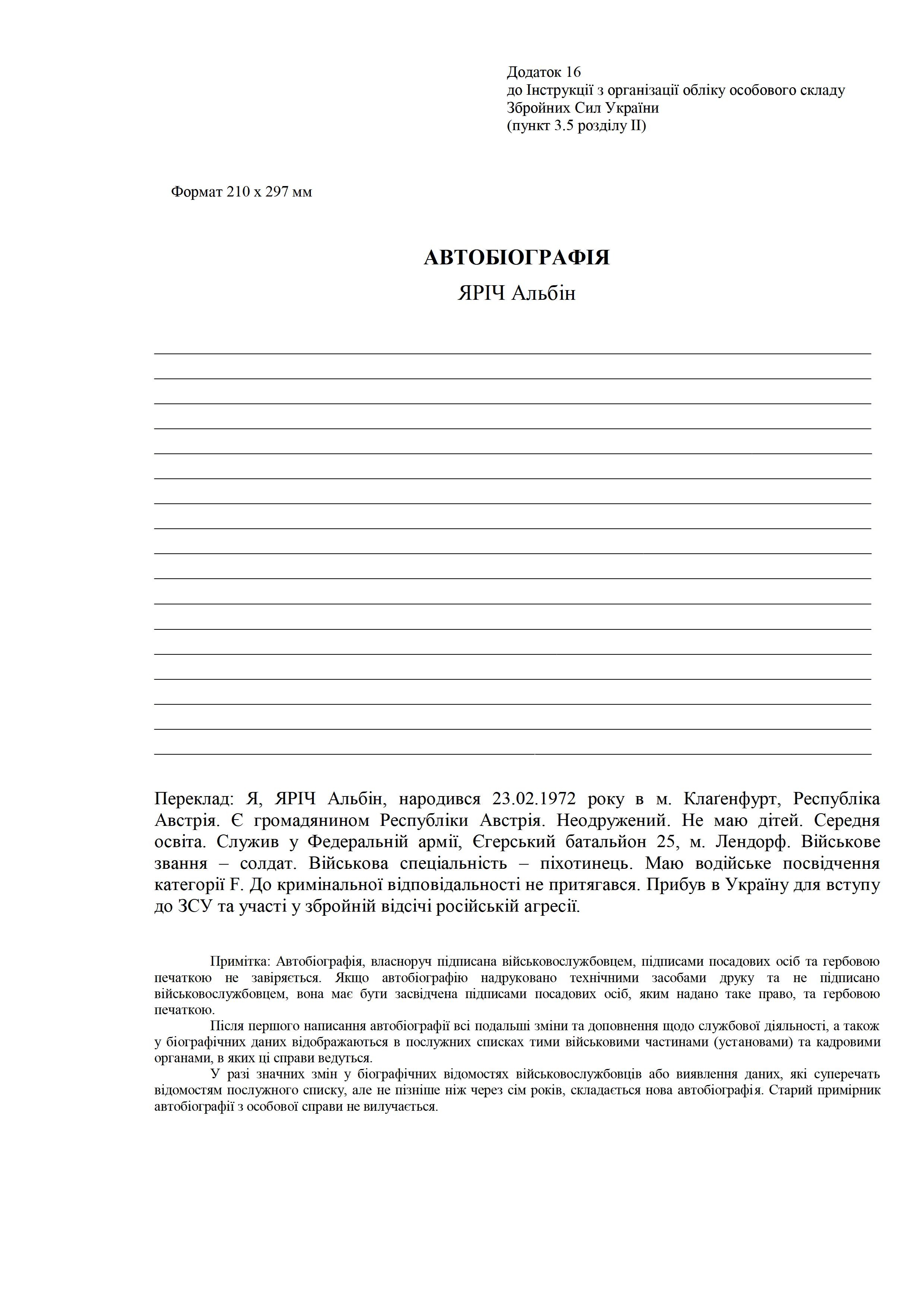 Документ о биографии наёмника - Ярича Альбина